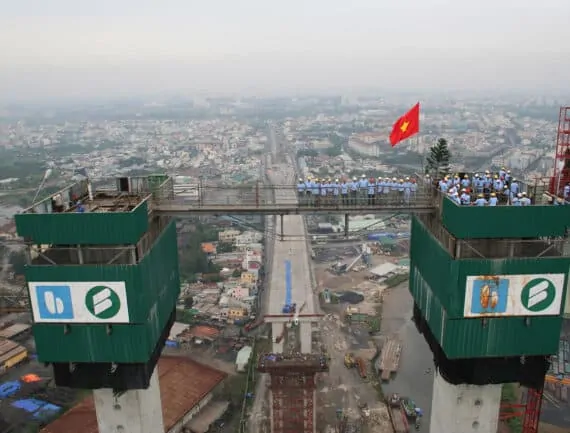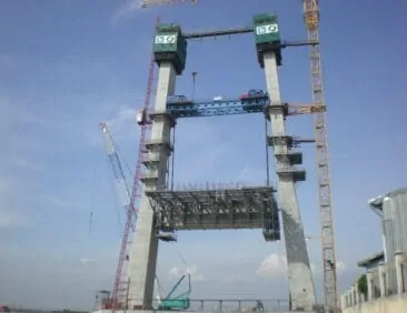 Design and supply of 2no. self climbing jump form systems and 2no. crane picked systems for construction of the main pylons. The H frame pylons slope at 4 degrees and taper in two directions with an architectural feature on the outside face.